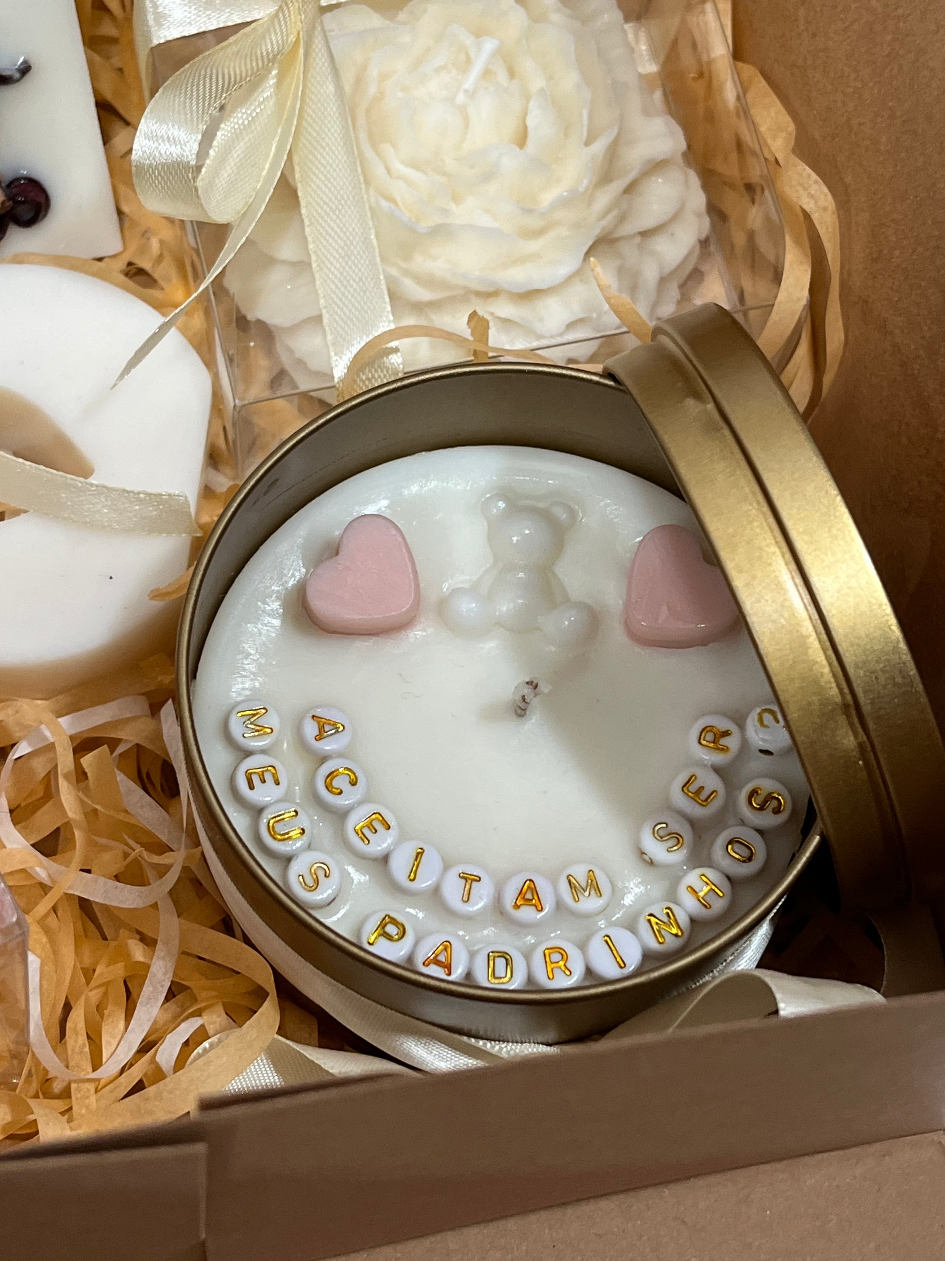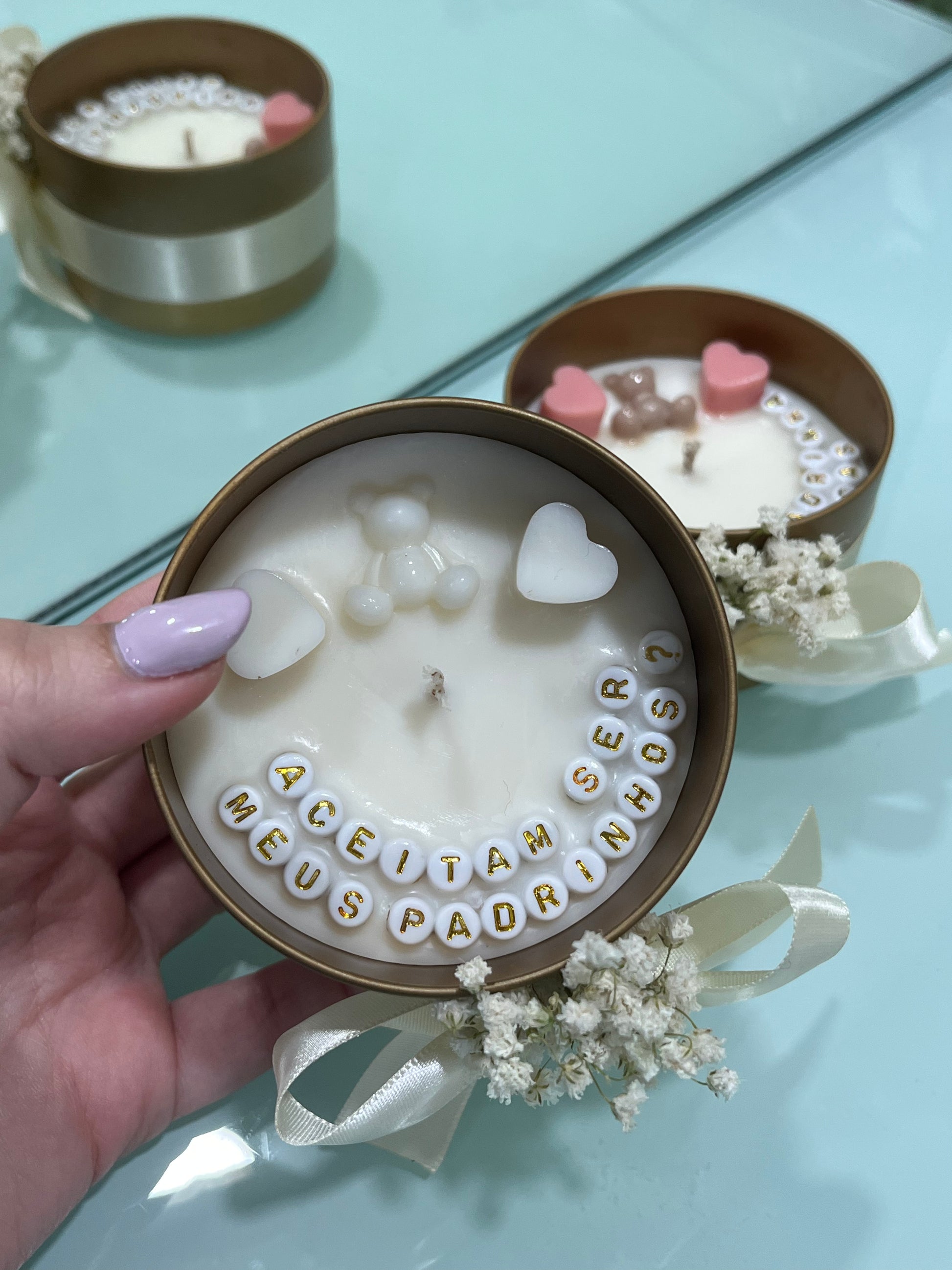 Surpreenda os futuros padrinhos com a nossa vela artesanal de 240ml, uma forma carinhosa e única de fazer este pedido tão especial.